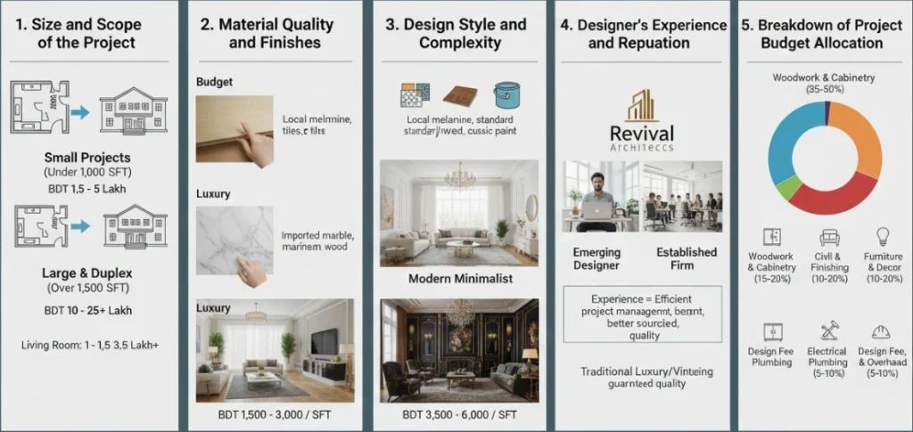 For a full-scale project that includes furnishings, flooring, false ceilings, and all execution, the total project costs can range widely, with small apartments potentially ranging from BDT 1.5 lakh to 5 lakh and larger, luxury homes easily exceeding BDT 25 lakh.